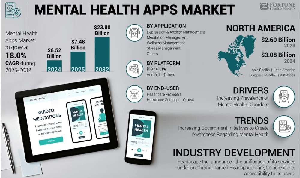 Fortune Business Insightsによると 、 メンタルヘルスアプリ市場は2024年に65.2億米ドル と評価され 、 2025年の74.8億米ドルから2032年に は 238億米ドルに成長し、 予測期間中に 年平均成長率(CAGR)18.0%で成長すると予測されています。北米はメンタルヘルスアプリ市場で最大のシェアを占め、 2024年には47.24%を占めました。