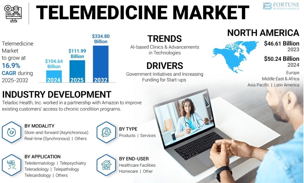Fortune Business Insightsによると 、遠隔医療市場は2024年に1,046.4億米ドル と評価され 、 2025年の1,119.9億米ドルから2032年には3,348億米ドル に 拡大すると予測されており 、予測期間中の年平均成長 率(CAGR)は16.93%となる見込みです 。北米が市場を牽引し、 2024年には48.01%のシェアを獲得しました 。