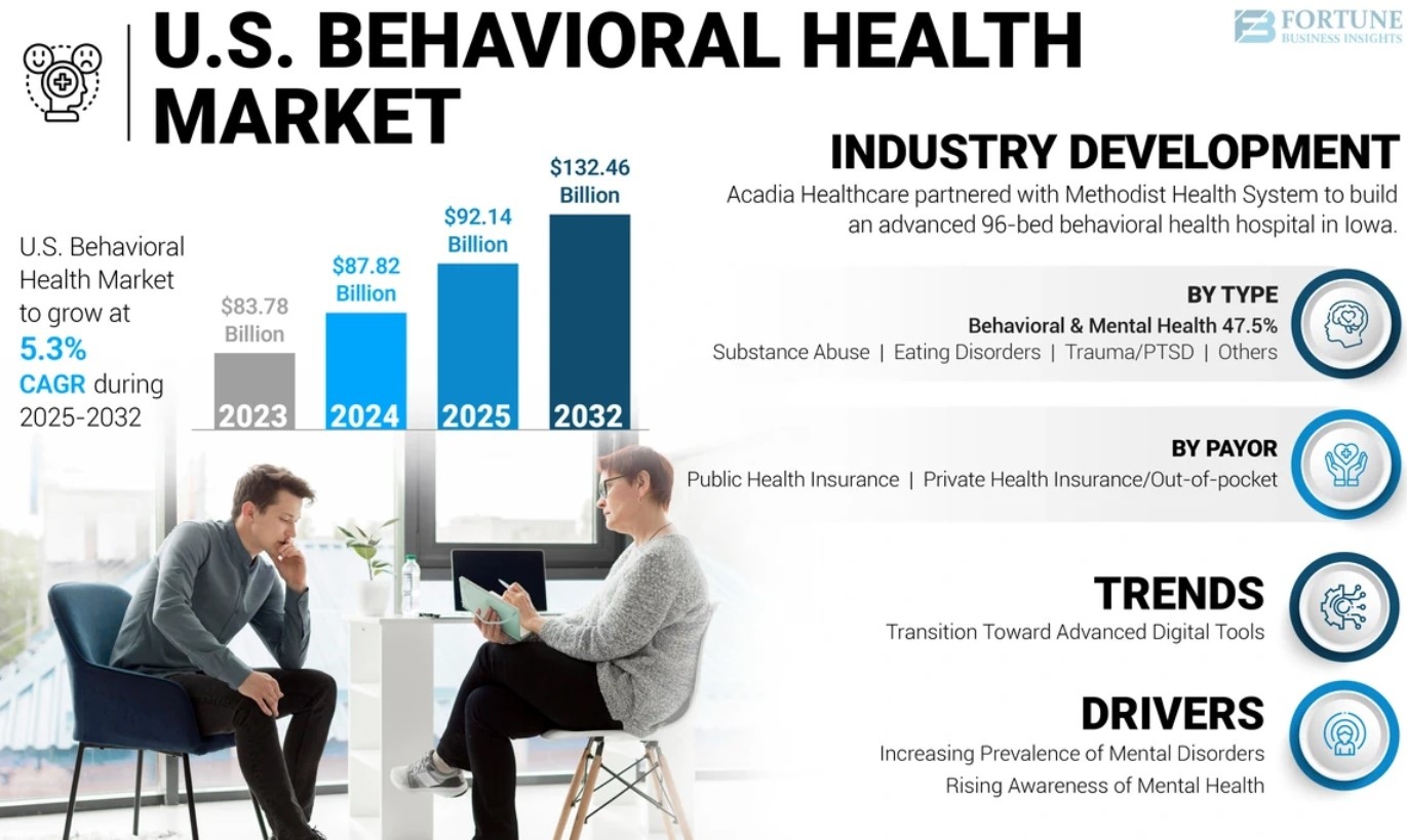 Fortune Business Insightsによると 、 米国の行動医療市場シェアは2024年に878.2億米ドル と評価され 、 2025年の921.4億米ドルから2032年には1,324.6億米ドル に 成長し 、 予測期間中に 5.3%のCAGRを示すことが 予測されています。